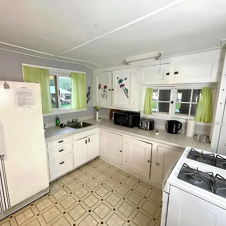 Een complete keuken in de gesitueerde in Kawartha Lakes 3-Bedroom Cottage #7 - Ambleside bevat alles wat je nodig hebt, waaronder een waterkoker, een koelkast en een kookplaat.